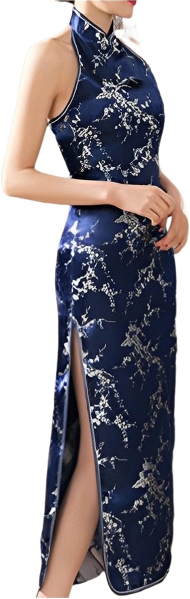 チャイナドレス ロング ノースリーブ セクシー コスプレ オフショルダー 服 e972 紺色( ネイビー, M)