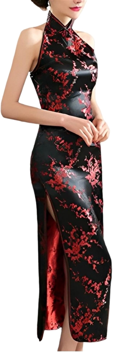 チャイナドレス ロング ノースリーブ セクシー コスプレ オフショルダー 服 e972(黒紅梅, XL)