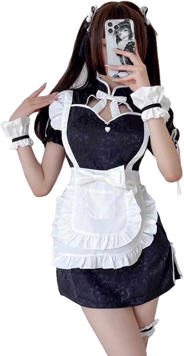 メイド服 チャイナ風 ショート丈 コスプレ 黒 セクシー ロリータ チャイナドレス(ブラック, S)