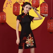 Women Slim Dress Slit Frog Button Traditional Cheongsam Short Chinese Qipao