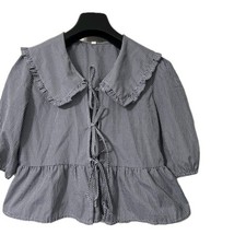 Womens Size Small Blue Gingham Check Peplum Tie Front Blouse Puff Sleeve