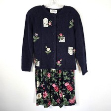 Vintage 90s Susan Bristol Sweater Skirt Set 10/M Navy Floral Embellished Cottage