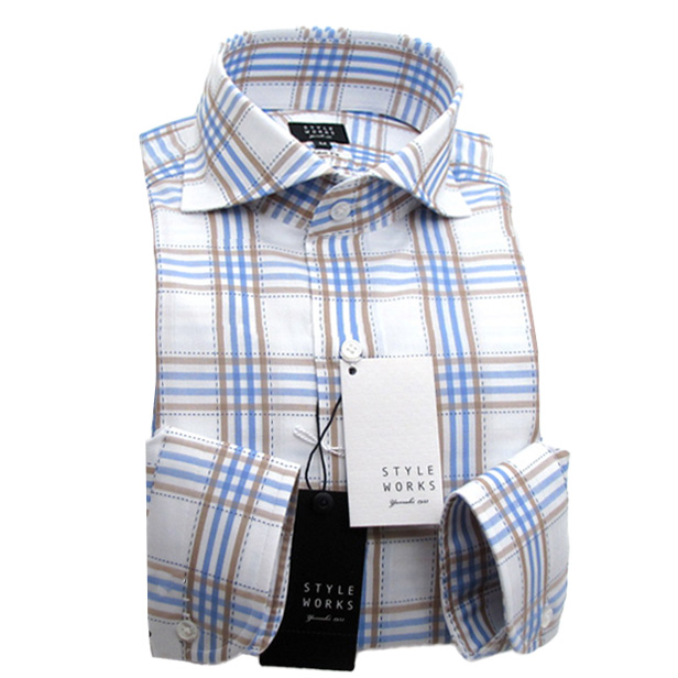 【STYLE WORKS】/ワイシャツ/綿100%/BLUE/ワイシャツ スリムフィット チェック ブルー ブロード STYLE WORKS-L
