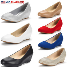 Womens Slip On Pump Shoes Low Wedge Heel Round Toe Comfort Work Dress Shoes