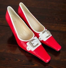 Melia Made In Italy Red Leather Pumps Womens US 13 EU 44 White Buckle Square Toe