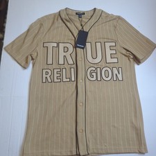 New True Religion Baseball Jersey Men's Small Tan Stripe Short Sleeve Logo Tr
