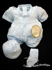 NWT Will'beth Blue Knit Button Newborn 3pc Romper Baby Boys Hat & Booties 0 M