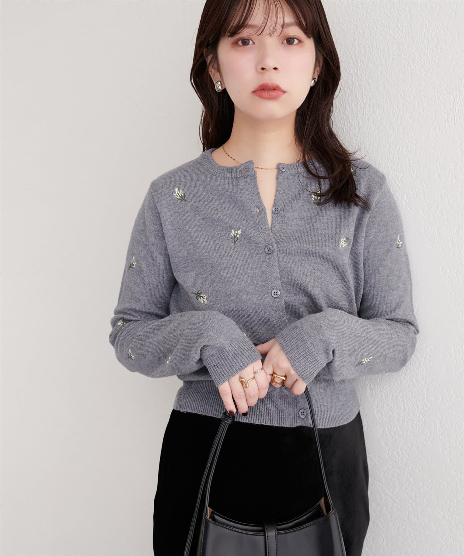 natural couture(ナチュラルクチュール) レディース PBTフラワー刺繍クロップドカーディガン チャコールグレー