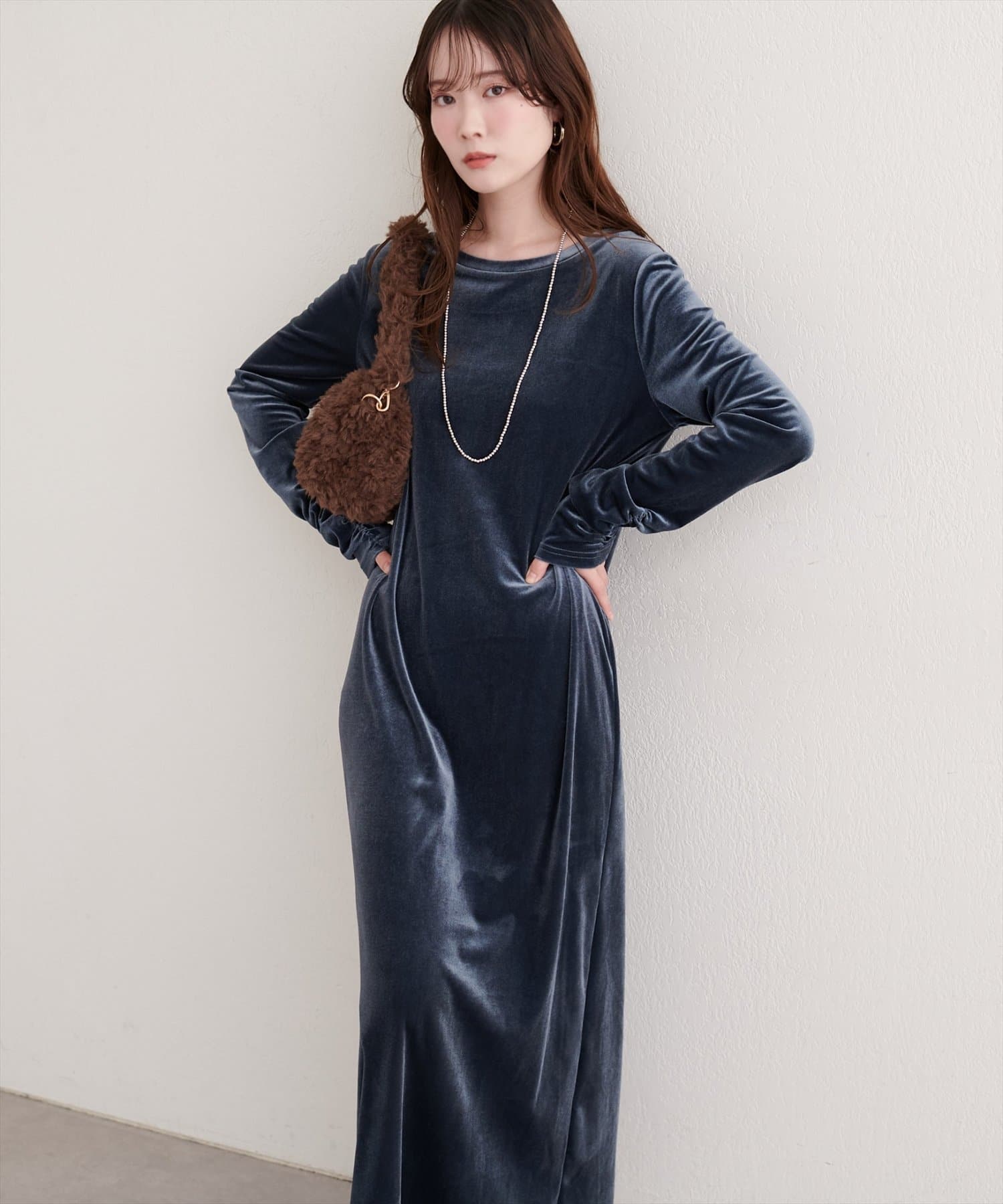natural couture(ナチュラルクチュール) レディース 袖口シャーリングベロアワンピ ブル-グレ-