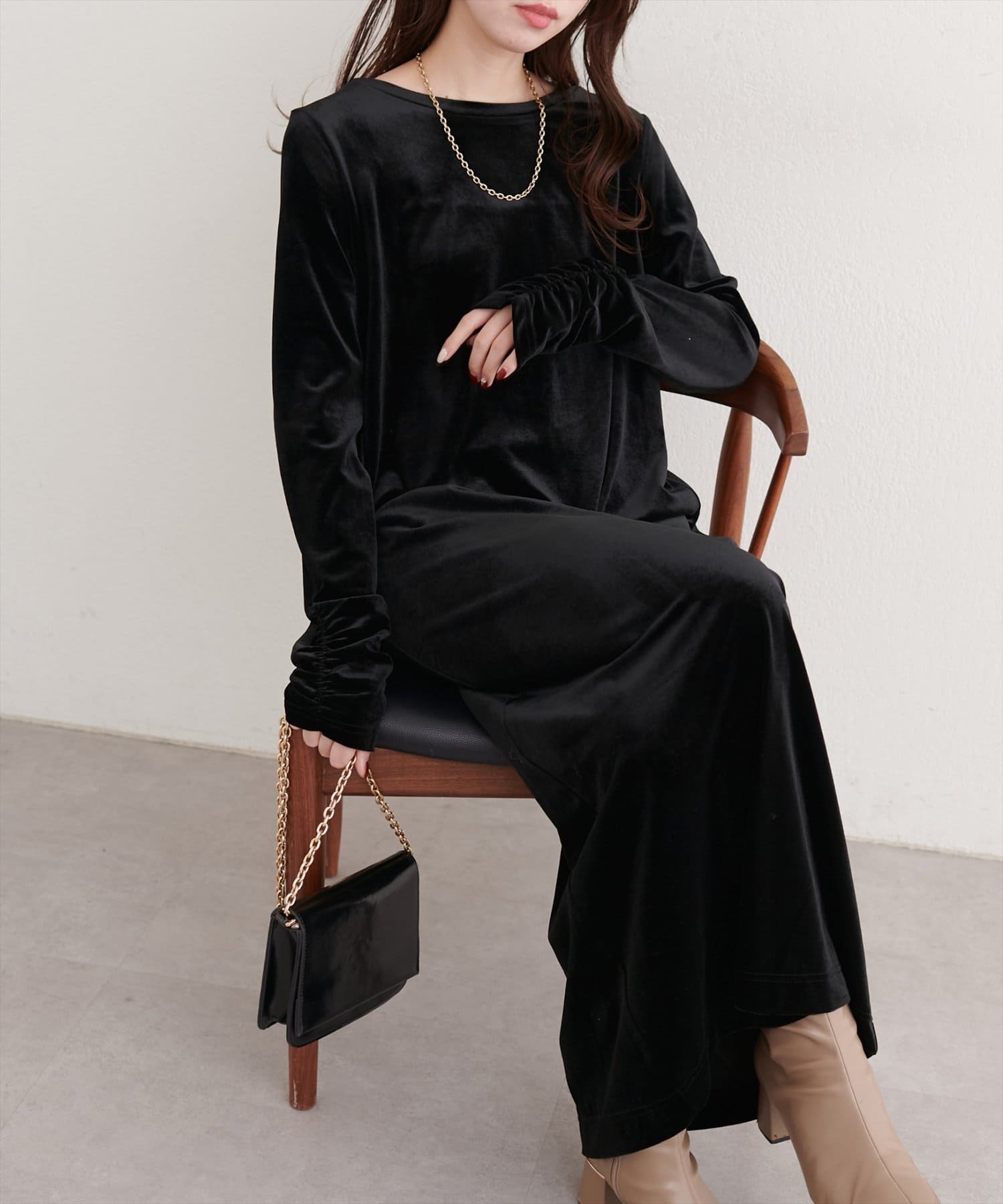 natural couture(ナチュラルクチュール) レディース 袖口シャーリングベロアワンピ ブラック