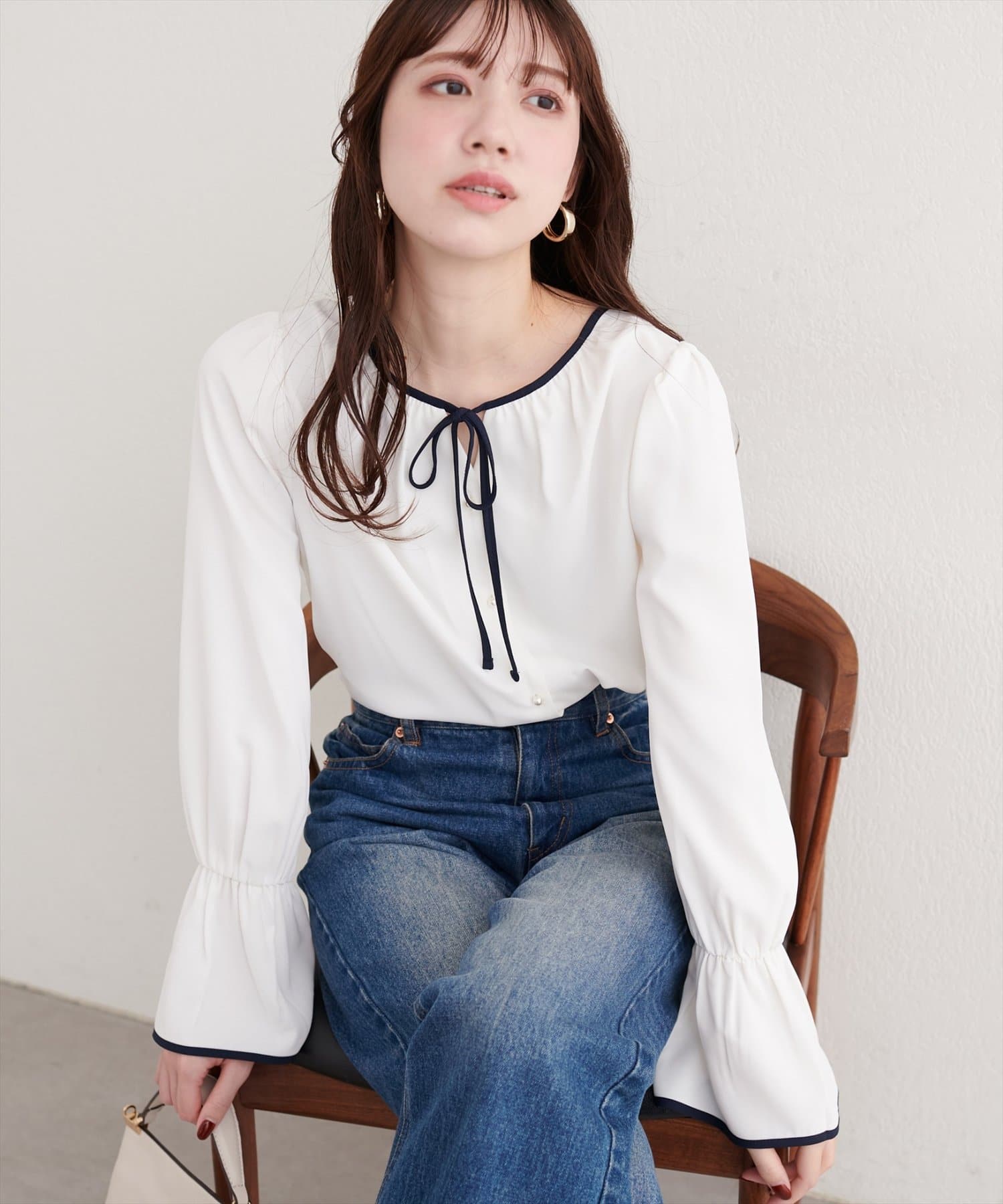 natural couture(ナチュラルクチュール) レディース フロントリボン配色ブラウス オフホワイト