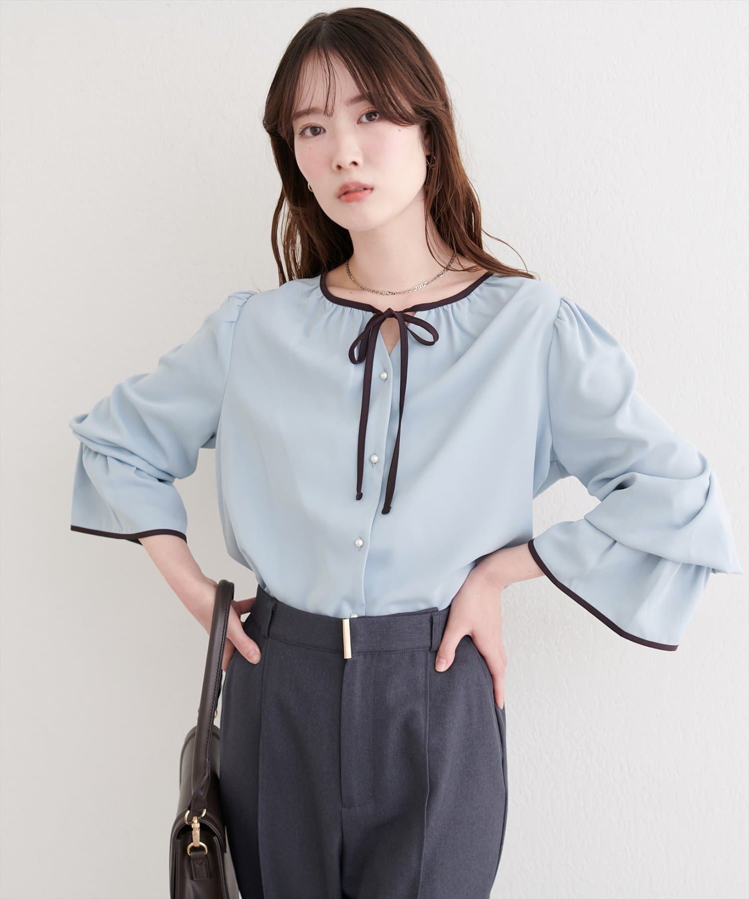 natural couture(ナチュラルクチュール) レディース フロントリボン配色ブラウス サックスブルー