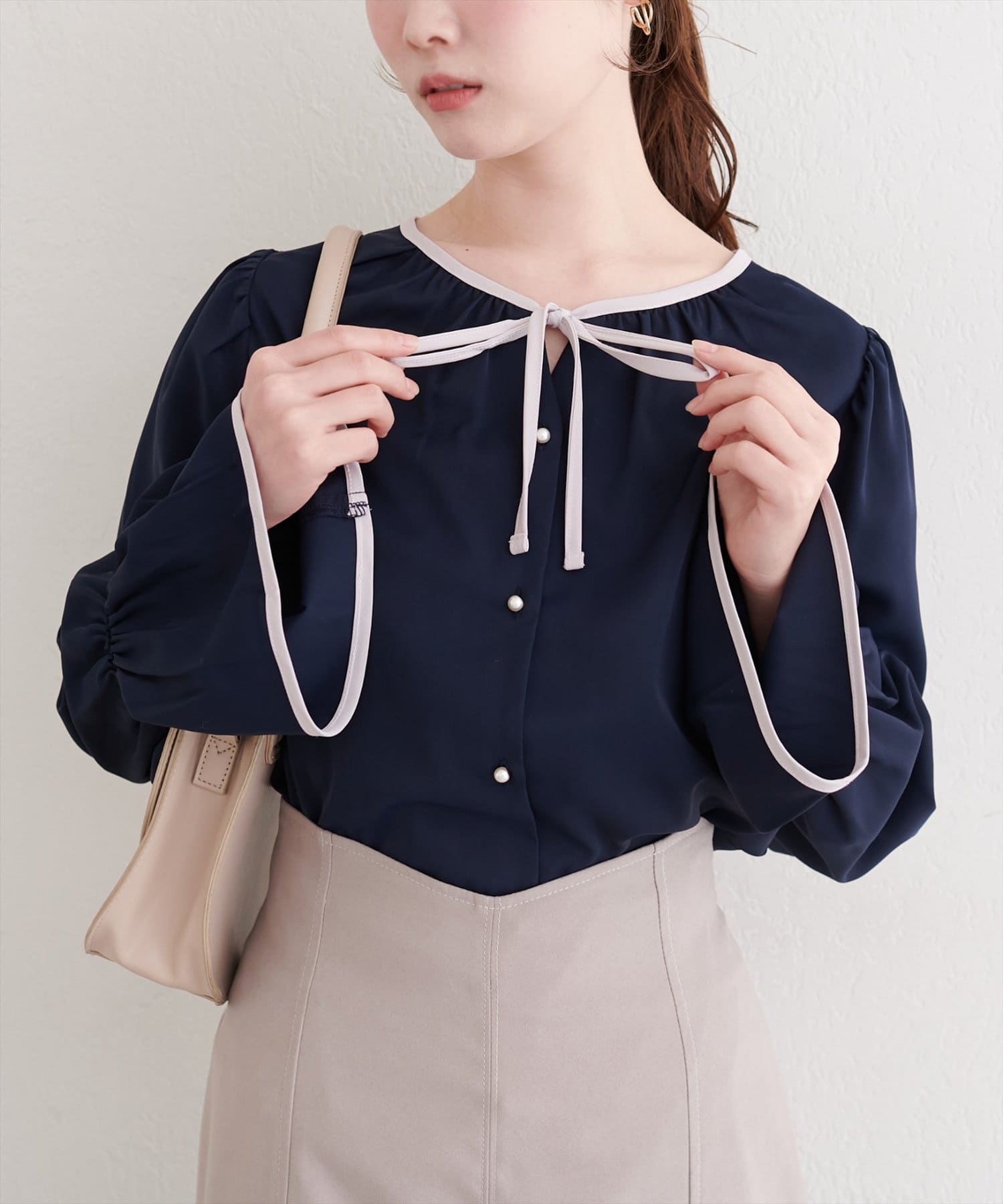 natural couture(ナチュラルクチュール) レディース フロントリボン配色ブラウス ネイビー