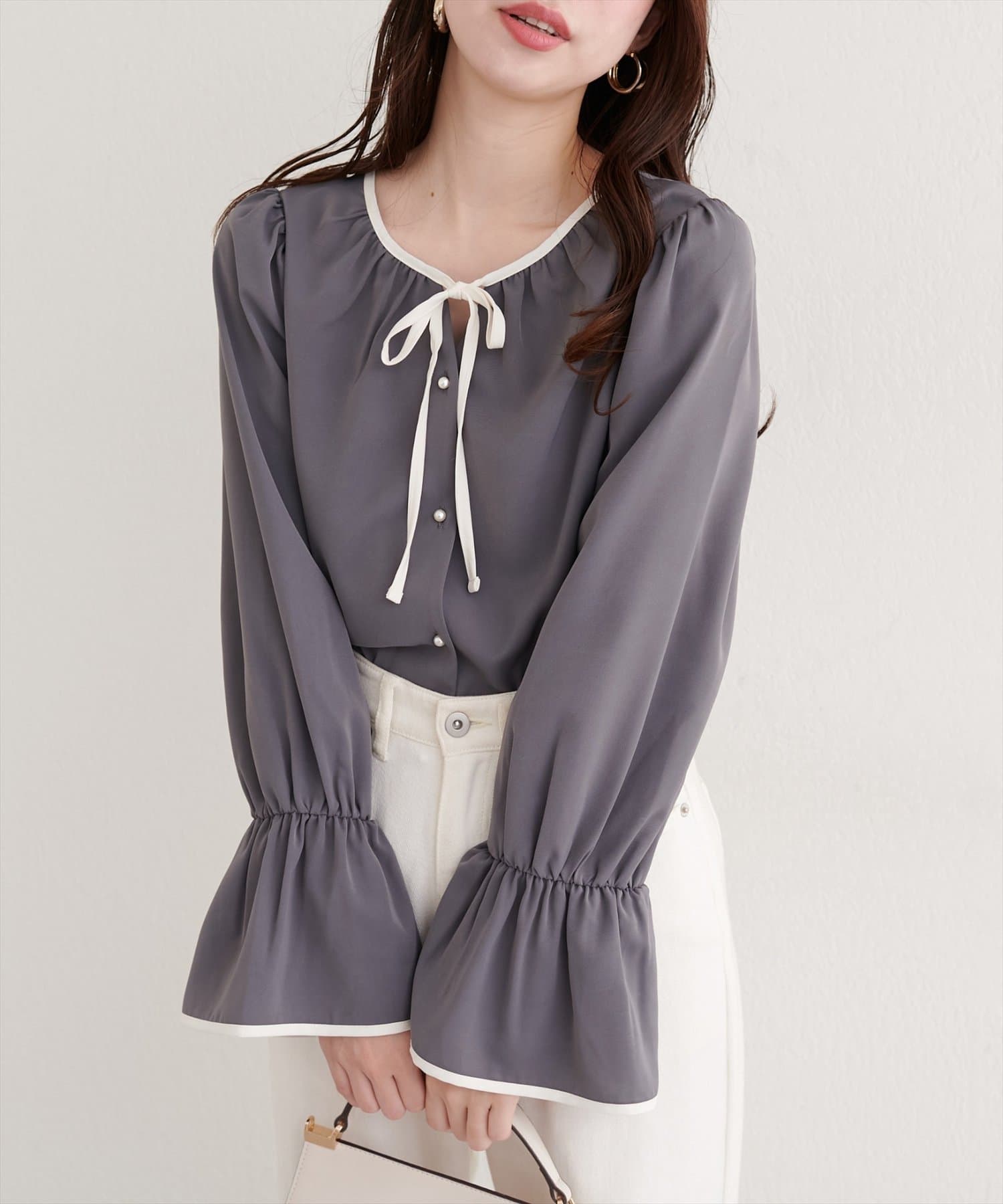 natural couture(ナチュラルクチュール) レディース フロントリボン配色ブラウス チャコールグレー