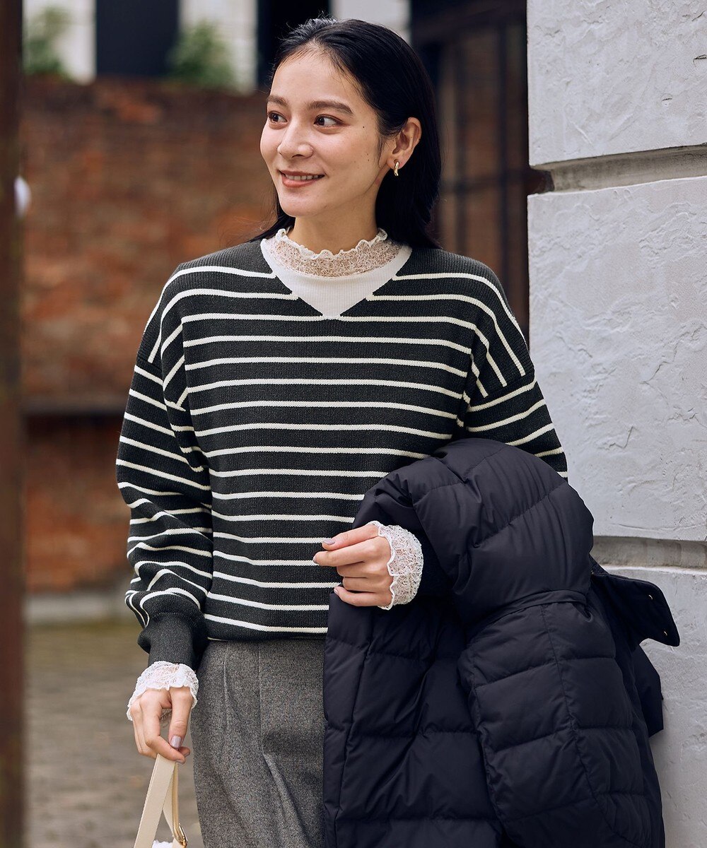 【オンワード】 ANY>トップス 【8色展開】Vネックデイリーニット チャコール×オフ F レディース